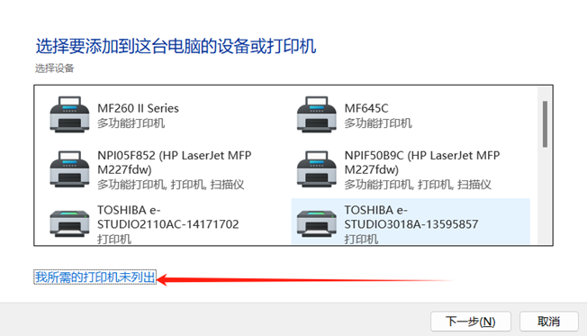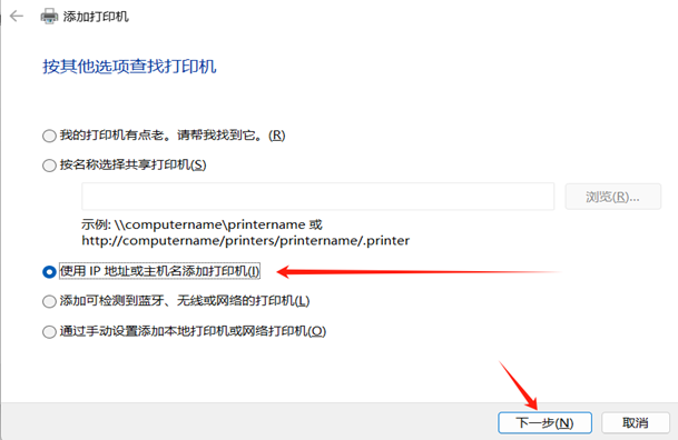 3、我所需的打印机未列出-----使用IP地址或主机名添加打印机-----下一步
