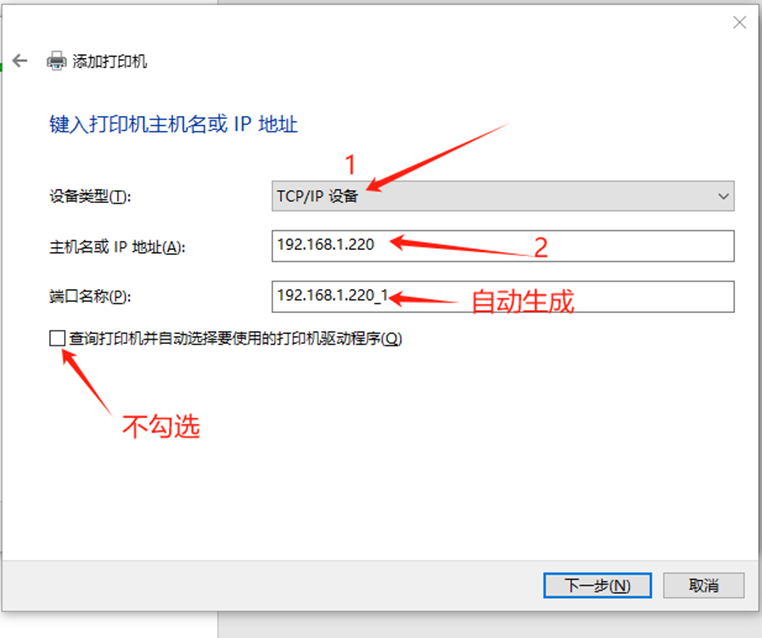 4、设备类型改为(TCP/IP设备),其他照图修改,然后下一步
